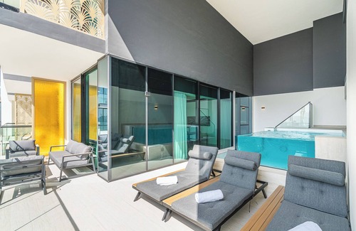 Experience ultimate relaxation in this modern 2 bedroom apartment at Binghatti Orchid, JVC—featuring your own private balcony lap pool!