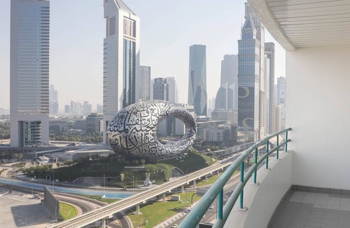 In this Opulent 2BR - 1450 SQft fully furnished holiday home; the living room and master bedroom overlook the Dubai Museum of the future / DIFC / Racecourse and the Dubai Skyline.
