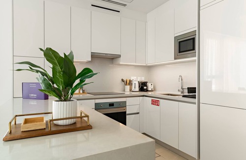 Modern kitchen equipped with essential appliances, including a stove, oven, full-sized fridge, toaster, kettle, microwave, dishwasher and espresso machine.