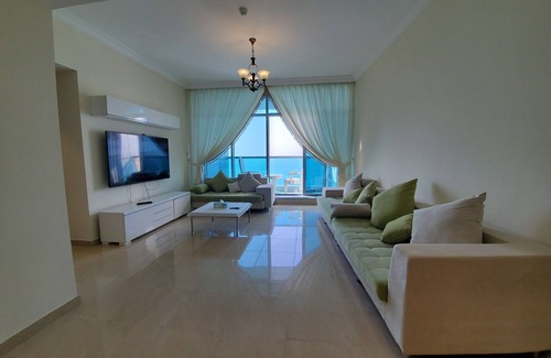 Sunset sea views Beachfront 2 Bedrooms fully furnished holiday apartment with swimming pool. Sea views from both bedrooms bed and hall room and balcony, it has one big hall room with sofas set, 75" smart TV, wireless internet connection and other furniture and big balcony with Dining area. It Beachfront apartment Less than 1munits walking distance from Ajman Beach. Our Building is located heart of Ajman Downtown, 25munits driveway from Dubai International Airport, and 14munits Driveways from Sharjah International airport. So many different types of restaurants like KFC, Pizza hut, Arabic, Asian, and European are located on the building's ground floor. Supermarkets, hypermarkets, and shopping malls are within walking distance.